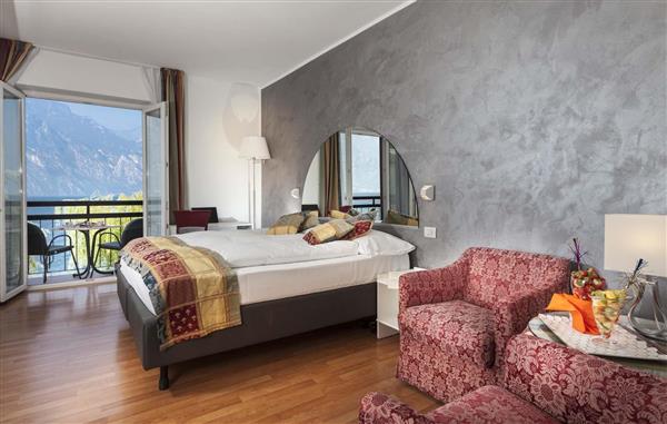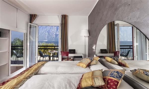 Etage -2. Zimmer mit Balkon und Seeblick, das Gemütlichkeit und Comfort bietet.